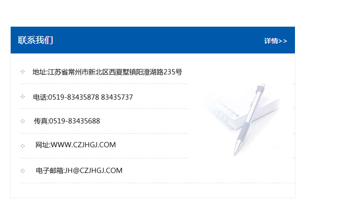 地址:常州市新北區友邦商務大廈1幢16、17層  電話:0519-85101652  傳真:0519-85112595  郵編:213022  網址:www.cz-jiayue_cn.bjzhuoqi.com  郵箱:xiajifengaa@163.com